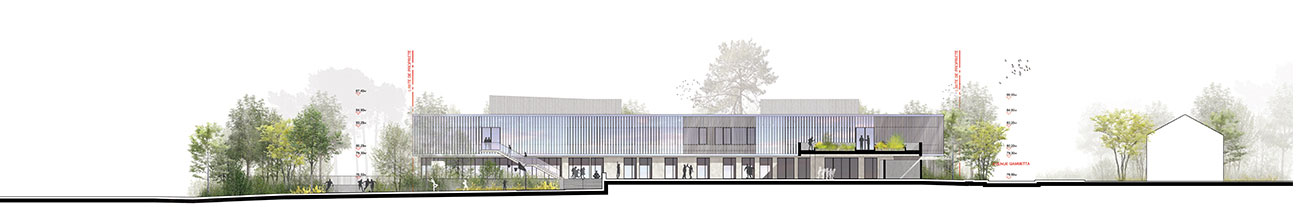 Pour ne pas se répandre sur le site et créer des liens visuels par des vides. Libérer des espaces extérieurs généreux pour l’équipement et le voisinage. Rentrer dans les objectifs performanciels.